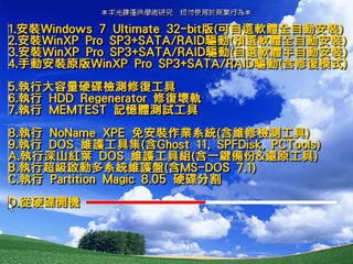 破解說明:安裝序號:一.純淨免無人職守安裝 Windows 7 Ultimate 32-bit 繁體中文版(免啟動)+軟體選單